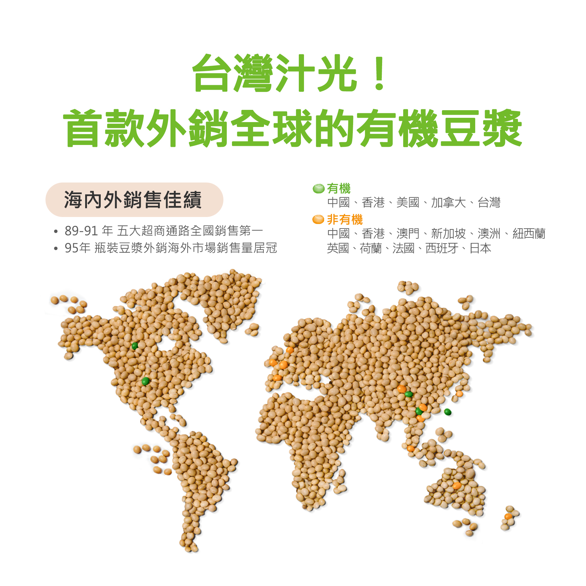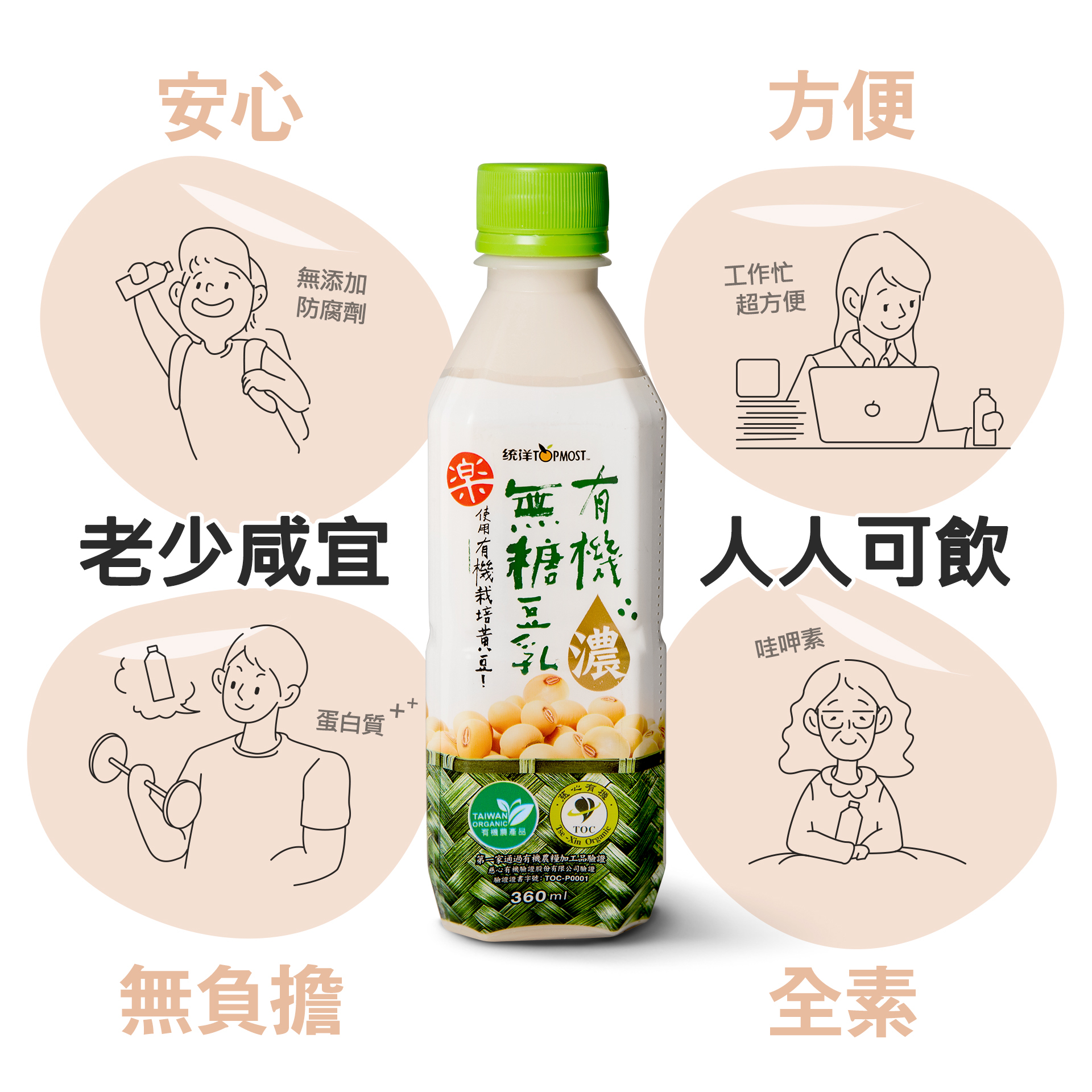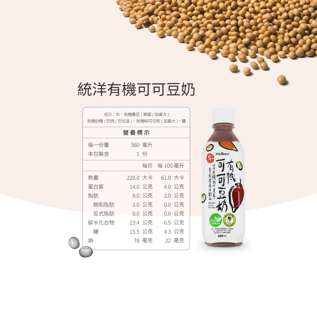 100%有機純可可粉添加,並堅持使用上等的原豆磨煮,搭配純淨的蘭陽水製造,豆香非常濃郁香醇順口,營養豐富,冷藏後風味更佳,亦可加溫飲用。是最自然又健康的養生的飲品。